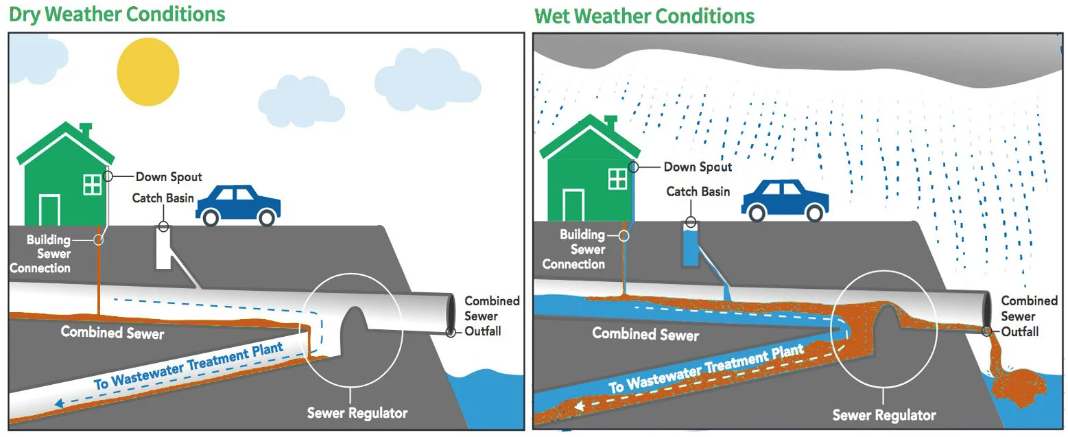 Like many older cities in North America (e.g.: Chicago, Toronto, Philadelphia, DC), New York has an antiquated and (now) under-sized combined sewer overflow system, making it particularly vulnerable to high rainfall events. When there is too much water in the sewage system, the treatment plant cannot handle this load. Without any other place to go, this mixture of untreated waste water and excess stormwater is allowed to overflow directly into the city’s waterways as depicted below. According to Riverkeeper, “more than 27 billion gallons of raw sewage and polluted stormwater discharge out of 460 combined sewage overflow (“CSOs”) into New York Harbor alone each year.”