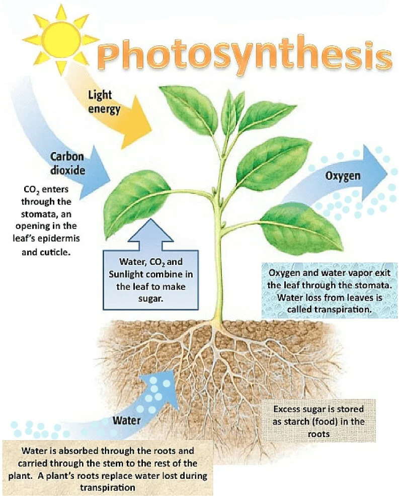 They convert from the sun’s light energy, the plants synthesize carbohydrates from the CO2 and water to be used for various plant functions. Oxygen is released as a waste product, and some water vapor is released via the stomata during transpiration.