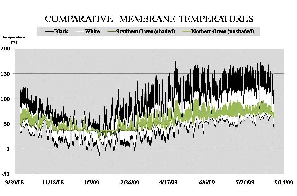 Comparative membrane temperatures for black, white and green roofs in NYC.
