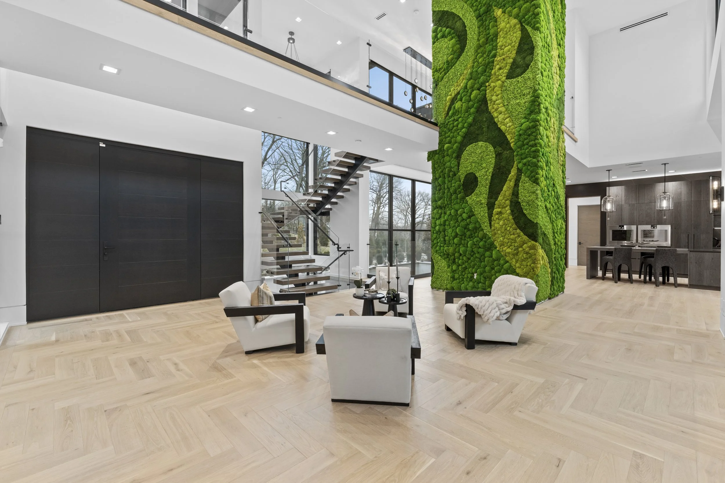 We were commissioned by the owner to design and build a dramatic, two-sided preserved moss column as a central biophilic feature in this newly constructed luxury residence in New Jersey. Rising 20 feet tall and spanning multiple stories, the column anchors the open-concept interior with an eye-catching blend of scale, texture, and natural color.
